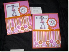 (Tickles, methinks? Anyone?) and my favorite tangerine grosgrain ribbon. Plus, it's pink - how can you possibly go wrong with that??? I keep telling my husband that when I get my convertible Beetle, I'm having it painted light pink. He thinks I'm kidding! **winky wink** Lily the giant German Shepherd will have to ride shotgun! Now there's is an image - don't forget the Doggles Goggles! HA! Now I'm just being a doofus - back to the important stuffs... The SU papers and inks were Pink Passion, Only Orange and Pixie Pink. The set I used is my old reliable - Girlfriend. (Imagine if I actually had a daughter!) I colored her using markers, and added the scallop circle and tangerine grosgrain for added flava. There's actually a layer of pink between the circle and scallop, but I'm strugglin' to see it here. Trust me, it looks spiffy!! I shoulda made sure the pics came out better before dropping them in the post box. Again, I am pretty sure this was stamplifted, so thanks! And I'm eternally sorry that I don't know who you are!