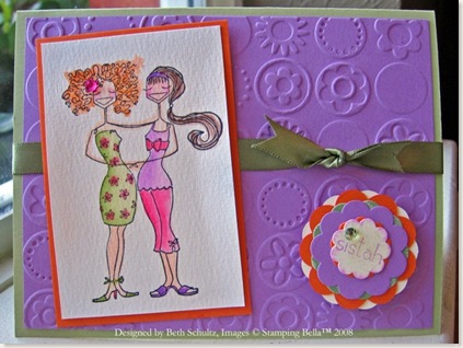 I just recently allowed myself to peruse and play with some Bella stamps - omigosh! These are sooo fun! I really went nutz and tried out a Cuttlebug, too. Let me tell ya, it was magical - kinda makes my sitting down with a light table seem a little laborous, to say the least! How cool would it be if SU made some folders for the Cuttlebug - or better still - the Cricut! OOOOOH! I am getting woozy just pondering the possibilities~ but I digress. We are talking hugs and Bellas... This was an SCS color challenge - I hope you are sitting for this: Pumpkin Pie, Orchid Opulence and Certainly Celery. Holy heartburn. But then, who doesn't love a curly redhead?! I think she rocks that 'do, don't you?!