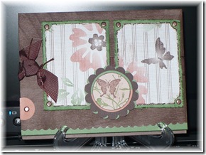 Wow, this sketch challenge was most definitely a challenge! Scamperin' scallops! This one cements that I really need to get some Nestibilities and the Cuttlebug scallop dies! I can hear my checkbook whimpering in the background, can you?? Anyhoo... I stamplifted the measurements from the sample sketch artist, but I think I would knock off 1/4" off the width of the panels since I added (of COURSE!) the wide grosgrain. Here's how one improvises whilst awaiting the man in brown... I wanted the background to be Chocolate Chip and to emboss the floral background on it, but alas, guess which color I am completely out of. Natch. So, I "dirtied up" a slice o' Close to Cocoa (direct-to-paper technique for those Bethspeak challenged!) and the texture it provided seemed like it would work. ***I think I will create a link with my Bethspeak goofisms. Goofisms will be on said list*** Once again, I digress... I really wish that scallop circle was larger. I liked the shadowy look of the Afternoon Tea DSP, so I shaded and dirtied up everything! Ugh - that circle is really buggin' me now... I used Essence of Love from the Occasions Mini, with the flutterby masked into the greenery. Flashback (or flashforward? For you non-Losties, that is the question rampant throughout this season. But I cannot believe there are ANY non-Losties out there...) a few catties... remember all that gor-geous copper vellum and paper we used to carry? **sigh I stockpiled it, and now I'm afraid to "waste" it. What a doofus, eh? I did allow myself to use the copper brads currently available in the antiques assortment, and some copper cord to gussy up the already amazingly awesome wide chocolate grosgrain. Oh, yeah, the scalloping along the bottom was an afterthought, and I couldn't cram the corner rounder up over my abundant dimensionals to do it properly... I dug around and found those Paper Shaper scissors. Now, I am sure there are clever crafters out there that can cut a straight line with those things - I ain't one of 'em! Holy headache. I need to pitch those bad boys. ugh... I think that about covers it. Did you take the challenge?