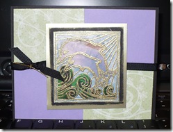 Today's Technique Challenge was to replicate a Cloisonne art piece. (Ready for your French diction lesson - Cl-WAH-zon-nay) Ok, so I didn't learn to spell or read using Hooked On Phonics, obviously, but that's close - in my little world. LOL Anyhoo... Think oriental style, gold detailed ceramic pieces. You'll recognize the intent when you go to SCS and see the samples. I went a different way, so mine doesn't exactly conjure images of the land of the rising sun. More like sea world. LOL ANY-hoo... basically, you emboss in gold on glossy magazine photos (can I just say there is NO substitute for SU powders? This "high quality" CRAPola I got at the craft store ROTZ!) Subsequently, when I took the challenge a step further and pieced together different pieces to get the colors, the 'leafing' came off gloriously. Very irritating! Let's also keep in mind that nuthin' sticks to glossy magazine paper, so handle gently! More gently than me, apparently! The other samples look impeccable.... **sigh I also swiped the layout from Beate's sketch challenge for last weekend. I really dig this layout and couldn't wait to try it out! Of course, the stampin' Big Girls rocked it much better, but I'm trying to get my procrastinatin' tush to the gym... hee hee - I'm usually making an excuse to AVOID the gym. Strange happenings here in sunny Maryland!! :) And now that I add the link, I see that I flubbed up the layout. No wonder it looks wonky! Oh wubz, I love it for what it is. I'll add a gold embossed sentiment later, and maybe pierce the corners or somethin'. I'll ponder it as I work off the ice cream I (who?) ate last night to soothe the beast in my forehead! :) Seemed like as good a reason as any - I haven't had ice cream for so long - omigosh, it was lovely. **sighs dreamily**